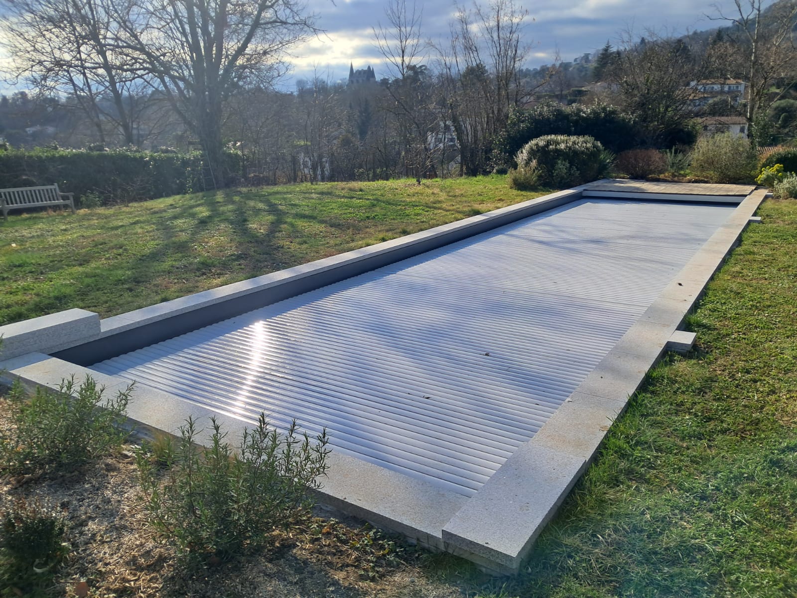 Remplacement des margelles : Nous remplaçons les margelles existantes par des margelles en granit gris du Portugal, un matériau de qualité supérieure offrant élégance et robustesse, tout en apportant une touche moderne à votre piscine.